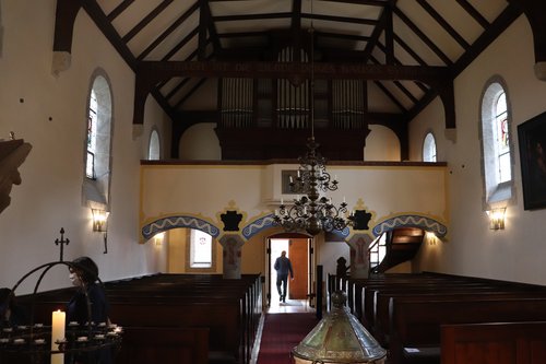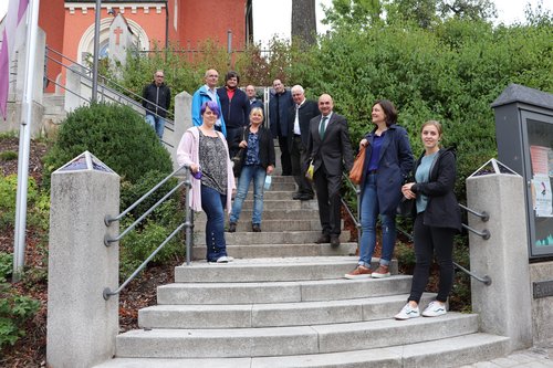 Als dritte Kirche besuchten wir das hübsche protestantische Kirchlein St. Zachäus das 1902 für die im Zuge im der Industrialisierung 120 zugezogenen Protestaten erbaut wurde. Die Kirche zeigt Jugendstilelemente und wurde zum Teil aus Betonfertigteilen in Natursteinoptik errichtet. Auch hier entstanden geringe Hagelschäden an den Buntglasfenstern, von denen eines wegen fehlender Dokumentation nicht mehr exakt rekonstruiert werden konnte. Die Architektin Barbara Wilnhammer berichtete von den Besonderheiten der Sanierung. Im Betonfundament musste ein Entfeuchtungsrahmen eingezogen werden, um der aufsteigenden Feuchtigkeit die Möglichkeit zum Entweichen zu geben.
