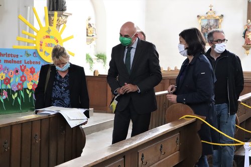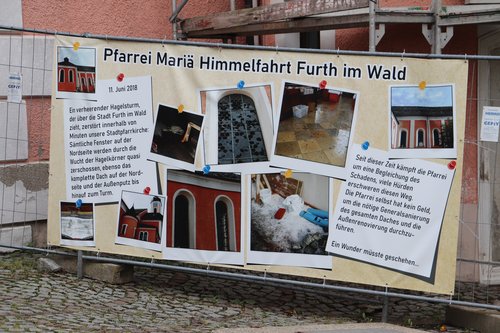 Auf Einladung des Ortsverbands und in Begleitung meines Kollegen Jürgen Mistol erkundete ich drei Kirchen in Furth im Wald. Hier hat am 11.Juni 2018 ein massiver Hagelschlag schlimme Schäden hinterlassen. Am schlimmsten hat es die Pfarrkirche Maria Himmelfahrt getroffen, deren Dach großen Schaden erlitt. Erhöht wird die Problematik dadurch, dass die Fundamente der Krypta unter aufsteigendem Grundwasser leiden. Eine Notsicherung durch Plastikplanen wurde sofort vorgenommen. Pfarrer Karl-Heinz Seidl berichtete, dass die Schäden an den Fenstern schnell behoben werden konnten. Die Versicherung jedoch zwei Jahre für das Schadensgutachten am Dach benötigte. In dieser Zeit ist auf dem Dach nichts vorwärts gegangen. Architektin Wilnhammer ergänzte, dass eine Begutachtung des Dachstuhls ergeben habe, dass es sich in Teilen um einen doppelten Dachstuhl, also einen barocken und einen jüngeren Dachstuhl handelt, die bei dieser Gelegenheit komplett saniert werden sollten. Eine denkmalpflegerische Voruntersuchung wurde umfangreich und detailliert erstellt. Große Probleme bereitet nun die Finanzierung. Die Baulast liegt prinzipiell bei der Kirchenstiftung. Denkmalfördermittel sind in größerem Umfang nicht zu erwarten, da aus dem Entschädigungsfonds nur Pfarrkirchen mit überregionaler Bedeutung gefördert werden können. Diese ist hier jedoch nicht gegeben. Sabine Weigand empfahl eine Finanzierungsanfrage bei der Bayerische Landesstiftung. „Außerdem müsste geklärt werden, welche Gelder die Diözese bereitstellen kann“, fügte Jürgen Mistol hinzu.
