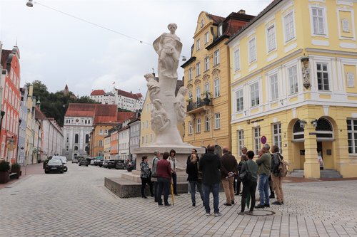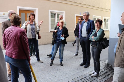In Landshut kam es zu einem freudigen Wiedersehen mit meiner Kollegin Rosi Steinberger und der ehemaligen Landesvorsitzenden Siggi Hagl in Begleitung von Joseph Wiesmüller vom Verein „Freunde der Altstadt“ und Elisabeth Oberpriller als Vertreterin der Stadt Landshut, etlichen Grünen Stadträt*innen sowie Vertretern der Medien. Am Kriegerdenkmal in der Landshuter Neustadt zu Füßen der Burg Trausnitz diskutierten wir zunächst über die Platzierung und künstlerische Gestaltung des Denkmals, das in außergewöhnlicher Weise an die Gefallenen des Ersten Weltkriegs erinnert. Das Denkmal wirkt wie ein Fremdkörper im barocken Ensemble. Bei der Sanierung des Platzes wurde über die Versetzung des Denkmals diskutiert, da sich jedoch eine Pattsituation im Gespräch mit den Bürgern andeutete, wurde das Denkmal an seinem Standort belassen. Der Bruch in der Ästhetik des barocken Ensembles steht symbolische für den Zivilisationsbruch, den jeder Krieg für eine Gesellschaft bedeutet, diskutierten die Anwesenden. Vielleicht könnte man dies mittels einer erläuternden Tafel verdeutlichen und damit die Akzeptanz im Stadtbild erhöhen. Eine wesentlich größere Problemstellung fand sich in unmittelbarer Nähe: Hier steht die Martinsschule, die das Ende des Ensembles Neustadt bildet und in städtischem Besitz ist. Der Stadtrat hat beschlossen das Gebäude zu verkaufen und würde mittlerweile sogar einen Abriss genehmigen, was im Widerspruch zur Position des Landesamtes steht, der sich wiederum die Altstadtfreunde angeschlossen haben. Drei Aspekte erschienen Sabine Weigand bei diesem Thema wichtig: „Erstens muss eine Kommune bei der Erhaltung ihrer Denkmäler und Bauten im Ensembleschutz eine Vorbildfunktion einnehmen; schließlich hat der Denkmalschutz in Bayern Verfassungsrang. Zweitens darf eine Kommune ein solches Filetstück mitten in der historischen Altstadt nicht aus der Hand geben. Drittens besteht bei einem Abriss die Gefahr, dass eine unpassende Nachfolgebebauung die historische Sichtachse zur Burg hin irreparabel beschädigen könnte“. Ein negatives Baubeispiel aus der jüngeren Vergangenheit ist das so genannte City Palais, das auf dem ehemaligen Gelände der Koller-Brauerei vor etwa 10 Jahren entwickelt wurde. Damals entstand eine gesichtslose, blockartige Bebauung, die wie ein Störfaktor mitten in der historischen Altstadt wirkt. „Hier haben wir ein Beispiel, wie Bauen im Bestand nicht aussehen darf. Landshut hat damit eine städtebauliche Chance in bester Lage vergeben“, so Weigand. „So etwas sollte nicht wieder vorkommen, zumal für diese Lösung auch noch zwei denkmalgeschützte Häuser geopfert wurden.“ „Zudem hielt sich der Bauherr nicht ihm gegebenen Auflagen und preiste die dafür fälligen Zwangsgelder ganz offensichtlich von vornherein ein“, ergänzte Stadträtin Siggi Hagl. Abgerundet wurde unser Besuch in Landshut mit dem denkmalgeschützte Firmerbräu, dem ältesten Wirtshaus der Stadt. 15 Jahre stand das Denkmal leer, bis es letztes Jahr von der Familie Hopfensberger erstanden wurde. Die neuen Besitzer sanieren derzeit das Haus samt Nachbargebäude in vorbildlicher Absprache mit den Denkmalschutzbehörden. Geplant sind ein Wirtshaus im Erdgeschoss, eine Arztpraxis im ersten Obergeschoss sowie Wohnungen im zweiten Ober- und Dachgeschoss, wobei Wert auf Barrierefreiheit gelegt wird. Probleme bereitete besonders die Statik. Ein Betonanker sowie ein aufwändiges Verfahren beim Fußbodenaufbau sichern zukünftig die Standfestigkeit. Der ehemalige Innenhof wird wieder freigelegt und bietet eine gute Möglichkeit für den Einbau eines Fahrstuhls. Der noch erhaltene gotische Dachstuhl im Nebengebäude, eine Rarität, wird wieder geradegerückt und darunter entsteht neuer Wohnraum. „Mit dieser Sanierung wird Landshut wieder ein Stück alter Wirtshaustradition geschenkt“, lobt Rosi Steinberger das Engagement der Familie Hopfensberger. Von den Anwesenden wurde beschlossen sich nach Fertigstellung der Sanierungsarbeiten in der neuen Gaststube auf ein Bier zu treffen.