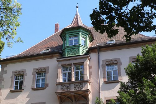 Das i-Tüpfelchen des Hauses ist ein Erkertürmchen im Dachgeschoss. Es wurden, so Kai Maier, viele Farbschichten freigelegt. Die dominierende Farbe war Grün, so dass man sich von Seiten des Denkmalschutzes auch bei dieser Renovierung dazu entschlossen habe, wieder Grün zu verwenden.