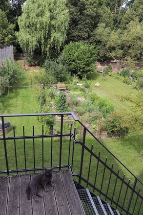 Die Isolierung wurde an der Außenwand angebracht, so dass das Fachwerk jetzt nur in den Innenräumen sichtbar ist. Die Heizung erfolgt über Wand- und Bodenbeheizung sowie eine ganzjährige Temperierung des Sockels im Erdgeschoss, die die Grundmauern trocken hält. Für Tageslicht im fensterlosen Bad und der Toilette sorgen innovative light tubes, Lichtspiegelröhren, die über eine Länge von 8 m Sonnenlicht vom Dach in den Raum leiten. Das Dach ist aufgedoppelt und mit Isofloc, einem Cellulosematerial, gedämmt. Das ausgeklügelte Energiemanagement wurde mit KfW-Mitteln gefördert.