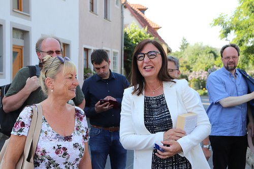 Der Besuch kam zustande auf Anregung von Hans-Christof Haas, Gebietsreferent des Landesamts für Denkmalpflege mit der Zuständigkeit für den Landkreis Kitzingen. Begrüßt wurden die zahlreichen Besucher von Bürgermeister Thomas Reichert und Vertretern des Stadtrats sowie der Landtagskollegin Barbara Becker, die zusammen mit Weigand im Landesdenkmalrat sitzt und die die überparteiliche Zusammenarbeit in Denkmalschutzfragen lobte. Patrick Friedl komplettierte als Grüner Betreuungsabgeordneter die Riege der Landtagsparlamentarier. Die Regierung von Unterfranken war vertreten durch Alexander Zeller, das Landratsamt durch Doris Lang (Untere Denkmalschutzbehörde) und Kreisheimatpfleger Heinrich Hüßner. Von den Grünen waren Gisela Kramer-Grünwald (Kreistag) und Eva Trapp (Kreisvorstand) anwesend.