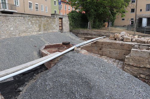 Die letzte Station in Würzburg war die im letzten Jahr bei Gartenbauarbeiten wiederentdeckte Mainlände nördlich der Alten Mainbrücke. Der Leiter des Gartenbauamtes Dr. Helge Grob berichtete vom Fund der Mainlände, deren Existenz zwar bekannt war, nicht jedoch der exakte Platz. Zu der Anlage gehört auch ein kleiner Pavillon, der sehr repräsentativ gestaltet war. Die Funktion dieses Baus ist aufgrund des Fundes neu zu bewerten.