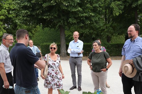 Ebenfalls zum zweiten Mal besuchte Sabine Weigand den Hofgarten der Residenz. In Begleitung von Gerhard Weiler, Leiter der Schloss- und Gartenverwaltung Würzburg, seines Stellvertreters Herrn Pechtold und dem Vizepräsidenten der Bayerischen Verwaltung der staatlichen Schlösser, Gärten und Seen Jochen Holdmann informierten sich die drei Abgeordneten über die Problematik der Wasserknappheit im Raum Würzburg. Hier wurde von einer dramatischen Situation gesprochen. Rasenflächen und Bäume werden in der Regel nicht bewässert, weil die dafür erforderlichen Wassermengen überhaupt nicht verfügbar sind. Die attraktiven Blumenbeete werden in einem festgelegten Rhythmus bewässert, jedoch nicht täglich. Das naheliegende Auffangen der Niederschläge in Zisternen funktioniert ebenfalls nicht - die Dachdeckung enthält Blei und weitere Metalle, was die Verwendung zur Bewässerung unmöglich macht. Der Klimawandel stellt den Betrieb vor erhebliche Probleme.