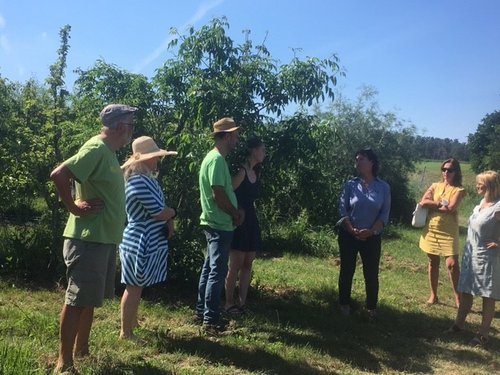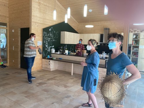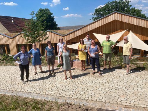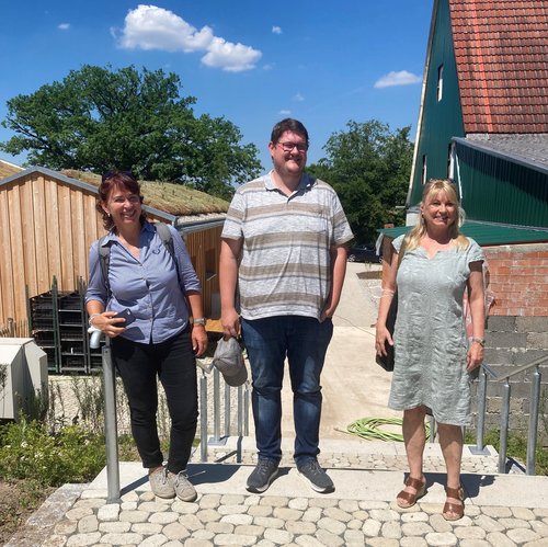 Die Betreiberinnen Karina Hechtel, Ingrid Dullnig und Ruth Simone Stumpp stellen der Delegation ihr Projekt vor, das auf gemeinwohl-fördernde Werte aufbaut und diese mit wirtschaftlichen Zielen verbindet. Ziel ist die Revitalisierung eines Jahrhunderte alten Bauernhofes. Hier werden Gemüseanbau und soziale Projekte verbunden mit einem Bauernhofkindergarten und -hort. Im Kindergarten, der auf dem Hof in dem neu gebauten Vollholz-Gebäude untergebracht ist, können die Kinder mit allen Sinnen lernen, entdecken und forschen.