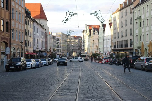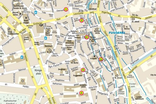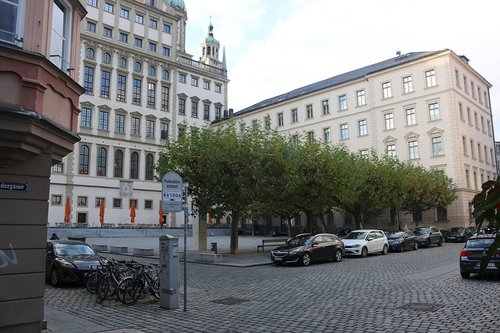 Elias-Holl-Platz: Dominiert von der Rückseite des Rathauses, ist hier ein funktionaler Platz entstanden. Die Umrahmung mit Bäumen hätte auf der Südseite des Platzes vervollständigt werden können. Wasser als gestaltendes Element im Zentrum würde einen weiteren Blickfang und gerade im Sommer noch etwas mehr Kühlung bringen.