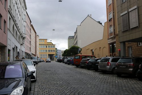Obstmarkt: Der Platz dient derzeit in erster Linie als Parkplatz. Wenige mittelgroße Bäume mit kugelartigen Kronen bringen etwas Grün auf den Platz, aber es ist auf jeden Fall Potential vorhanden, hier einen attraktiven Stadtplatz zu ermöglichen.