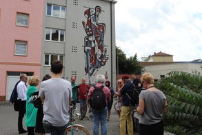 Zunächst wurde Kunst am Bau aus der Nachkriegszeit thematisiert. Für öffentliche Gebäude galt die Regelung, dass 1 – 2 % der Bausumme für Kunst ausgegeben werden mussten. Einerseits sicherte das den Kunstschaffenden ein Einkommen in einer Zeit, in der für viele Menschen das Überleben wichtiger war, als kulturelle Dinge. Andererseits wurden dabei zeitgenössische Werke geschaffen, die die Architektur dieser Zeit prägten.