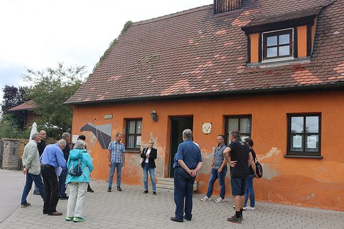 Das erste Ziel des Besuchs war das Hirtenhaus im Ortsteil Untermainbach. Wie der Name bereits erkennen lässt, war das Haus eine temporäre Unterkunft für Schäfer. Mit dem Verschwinden dieses Berufs wurde das Haus „armen Konfirmanten“ als Wohnung zu Verfügung gestellt. Seit den 80er Jahren wird das Haus als Treffpunkt für den Arbeitskreis Heimat und Geschichte genutzt. Das Vertragsmodell besagt, wie es „in Rednitzhembach üblich ist“, so Bürgermeister Spahl, dass das Gebäude im Besitz der Gemeinde ist, der Unterhalt jedoch vom nutzenden Verein getragen werden müsse. Augenfällig ist der abplatzende Putz. Verursacht wird dieser Mangel durch falsche Verwendung von Materialien. Auf Sandstein dürfe keinesfalls Zementputz aufgetragen werden, so Denkmalfachmann Danninger. Sandstein benötigt diffussionsoffene Putze, damit Feuchtigkeit abgegeben werden kann. Die Vertreter des Arbeitskreises wollen diese Arbeiten soweit möglich in Eigenleistung angehen. Sabine Weigand drückte ihre Hoffnung aus, dass die Gemeinde hier unbürokratisch unterstützt, z.B. durch Bereitstellung von Containern und Baumaterialien, Beratungsleistungen oder sogar mit professioneller Unterstützung.