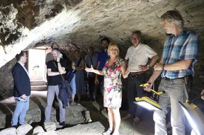 Zweite Station in Rothenburg war die Judengasse, wo die Stiftung Kulturerbe Bayern, vertreten durch Herrn Himpsl und der Verein Alt-Rothenburg, vertreten durch die Herren Naser und Knoll, stolz ihr Sanierungsprojekt Judengasse 10 präsentierten. Die Stiftung wurde nach dem Vorbild des National Trust gegründet, um bürgerschaftliches Engagement in den Denkmalschutz zu bringen. Sie möchte die historischen Baudenkmäler vor dem Verfall bewahren und einer sinnvollen Nutzung zuführen. Das Haus Judengasse 10 ist ihr erstes großes Projekt, das sie mit Unterstützung des Vereins Alt-Rothenburg mit Enthusiasmus angeht. Im ersten Stock des Denkmals findet sich noch eine sehr gut erhaltene mittelalterliche Bohlenstube. „Der Fund der Mikwe im Keller ist ein absoluter Glücksfall. Dieses jüdische Ritualbad wurde vermutlich von der gesamten jüdischen Gemeinde genutzt und wird, wie es der Glaube verlangt, von lebendigem Wasser gespeist, in diesem Fall Grundwasser“, erläutert Weigand. Das zukünftige Nutzungskonzept sieht Wohn- und Vereinsräume vor. Das Erdgeschoss soll öffentlich zugänglich werden. Das Nebenhaus, in Besitz des Vereins Alt-Rothenburg, soll zeitgleich saniert werden. „Es ist der Stiftung Kulturerbe Bayern zu wünschen, dieses Objekt erfolgreich zu sanieren und damit mehr Unterstützer zu gewinnen“, so Weigand.