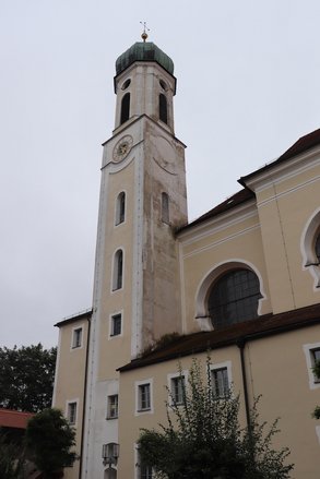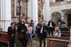 Im Mittelpunkt der Besichtigung stand das ehemalige Klosterareal und die St.-Anna-Kirche, die sich im Besitz einer Stiftung befinden. Der schöne Innenhof grenzt an die Stadtmauer, die Schongau noch als kompletter Ring umschließt und für den Tourismus in Zukunft aufgewertet werden soll. Durch die St. Anna Kirche führte der stellvertretende Stadtbaumeister und berichtete über die Sanierunsgbedürftigkeit des Kirchturms, der Fassade und der Gemälde im Inneren. Das Projekt soll mit Unterstützung des Entschädigungsfonds finanziert werden. Es bleibt aber noch ein großer Betrag, den die Stadt aufbringen muss, bzw. für den sie weitere Unterstützer sucht. „Es ist ein generelles Phänomen, dass viele Kirchen nicht mehr für sakrale Zwecke benötigt werden. Man muss sich darüber klar werden, welche Zukunft solche Gebäude haben sollen. Hier darf man die Augen nicht vor ungewöhnlichen Nutzungsmöglichkeiten verschließen“, erläutert Weigand ihre Position.