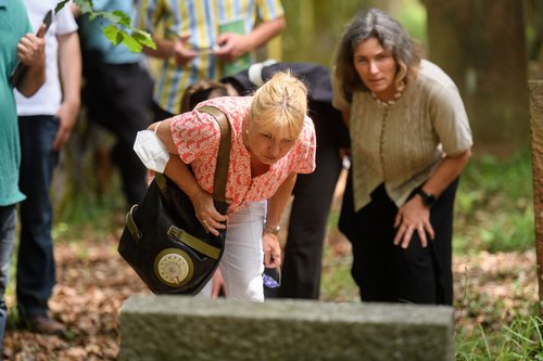 Den Abschluss bildete der Besuch des jüdischen Friedhofs auf dem Bergrücken nördlich des Ortes. Die romantische Lage ist der Tatsache zu verdanken, dass hier wie in anderen Orten früher nur Grundstücke zur Totenbestattung an die jüdische Gemeinde verkauft wurden, die sonst nicht nutzbar waren - oft steile Hänge oder Bergrücken. Auf dem Friedhof läuft derzeit die Inventarisierung an, die von Susanne Klemm geleitet wird. Zunächst musste sie nach ergonomischen Wegen gesucht werden, wie die Friedhöfe vermessen, die Grabstellen inventarisiert, die Grabstein fotographisch dokumentiert und die hebräischen Inschriften übersetzt werden können. Besondere Herausforderungen stellen der fortgeschrittene Verwitterungsprozess des Sandsteins und der Flechtenbewuchs dar.