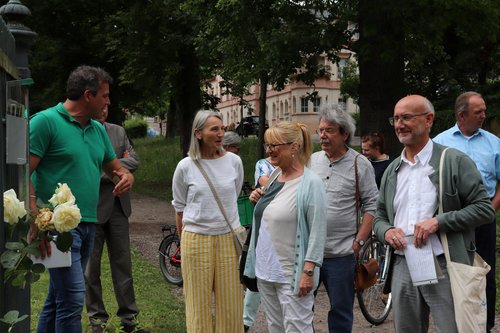 Die zweite Station des Tages war Donaustauf, wo wir von Bürgermeister Sommer und den örtlichen Grünen herzliche begrüßt wurden und wo uns Gerd Vangerow durch den Fürstengarten führte, der ursprünglich als Park der fürstlichen Sommerresidenz der Familie Thurn und Taxis in den 1830er Jahren angelegt wurde. Ein chinesischer pagodenähnlicher Turm bildet die Attraktion der Anlage. Eine Maulbeerbaumallee erinnert an den Versuch der Nazis im „Dritten Reich“ die Seide für Militärfallschirme im eigenen Land herzustellen.